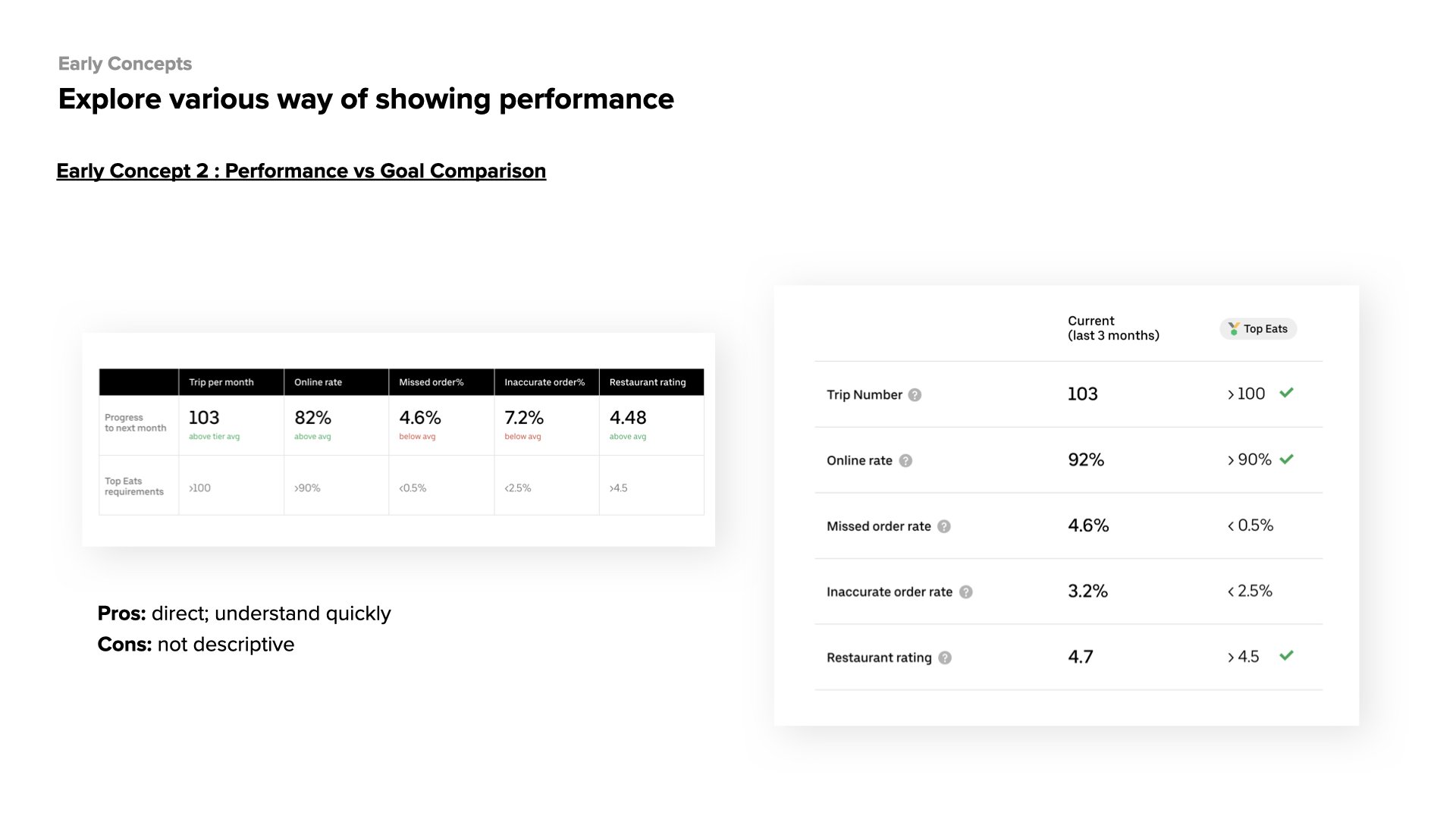On the Top Eats page, users can view two kinds of performance: 1. progress towards next month Top Eats status (current performance); 2. performance evaluation that determined this month’s status.